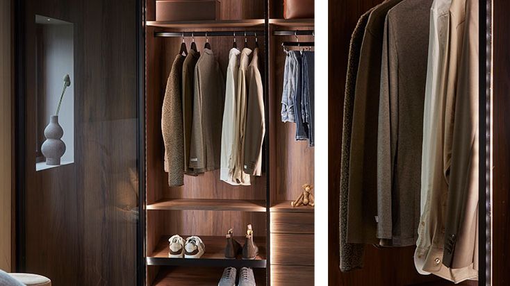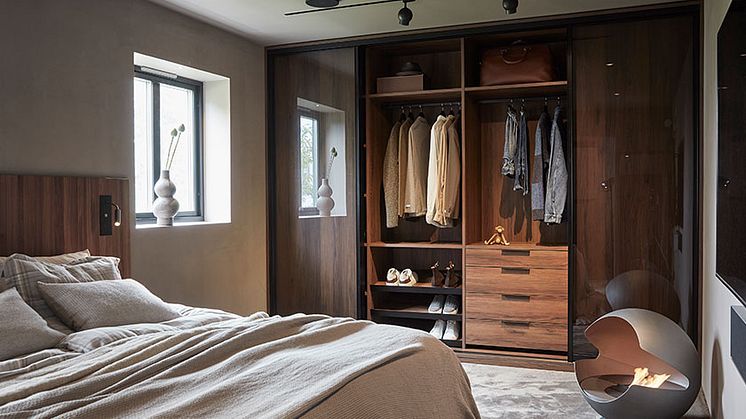 Valnøtt er tilbake! For deg som ønsker det lille ekstra til garderobeløsningen kan vi nå presentere våre nyheter i valnøtt. Tre i valnøtt føles eksklusivt og elegant, og gir en lun følelse i hjemmet. Valnøtt passer bra sammen med jordfarger, men også hvitt, grått og friskere pasteller passer godt. Nyheten kommer som valg til alle våre skyvedører med profil (Nano fom. 1. april 2022). Til modellen Showstopper kan du velge valnøtt til både ramme og fylling for en ekstra luksuriøs følelse. Vi tilbyr vår nye utførelse i valnøtt på all øvrig innredning og skrog til din garderobe.