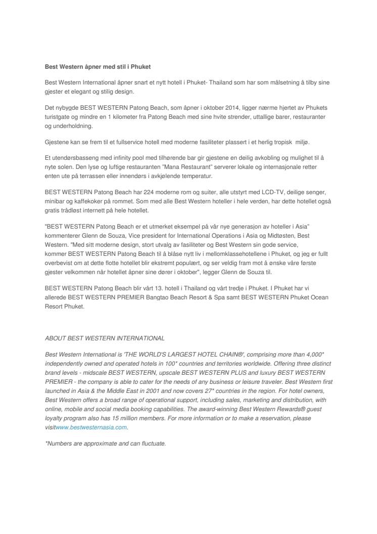 Best Western International åpner snart et nytt hotell i Phuket- Thailand som har som målsetning å tilby sine gjester et elegant og stilig design.
