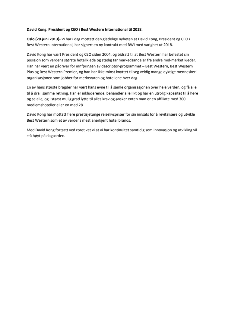 Vi har i dag mottatt den gledelige nyheten at David Kong, President og CEO i Best Western International, har signert en ny kontrakt med BWI med varighet ut 2018.