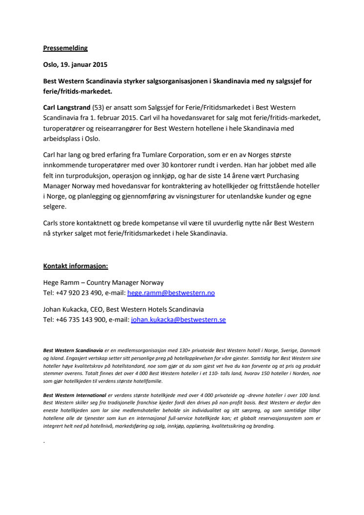 Carl Langstrand (53) er ansatt som Salgssjef for Ferie/Fritidsmarkedet i Best Western Scandinavia fra 1. februar 2015. Carl vil ha hovedansvaret for salg mot ferie/fritids-markedet, turoperatører og reisearrangører for Best Western hotellene i hele Skandinavia med arbeidsplass i Oslo.
