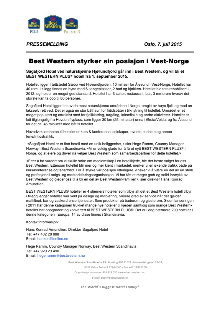 «Sagafjord Hotel er et flott hotell med en unik beliggenhet,» sier Hege Ramm, Country Manager Norway i Best Western Scandinavia. «Vi er veldig glade for å få et nytt BEST WESTERN PLUS® i Norge, og at eiere og driver nå velger Best Western som samarbeidspartner for dette hotellet.»