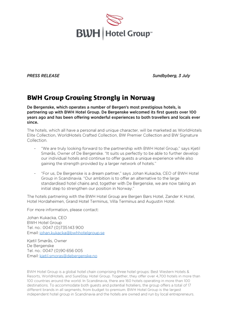 De Bergenske, som driver flere av Bergens mest velrenommerte hoteller, innleder et samarbeid med BWH Hotel Group. De Bergenske ønsket sine første gjester velkommen for over 100 år siden, og har siden den gang levert gode opplevelser for både tilreisende og lokalbefolkningen.