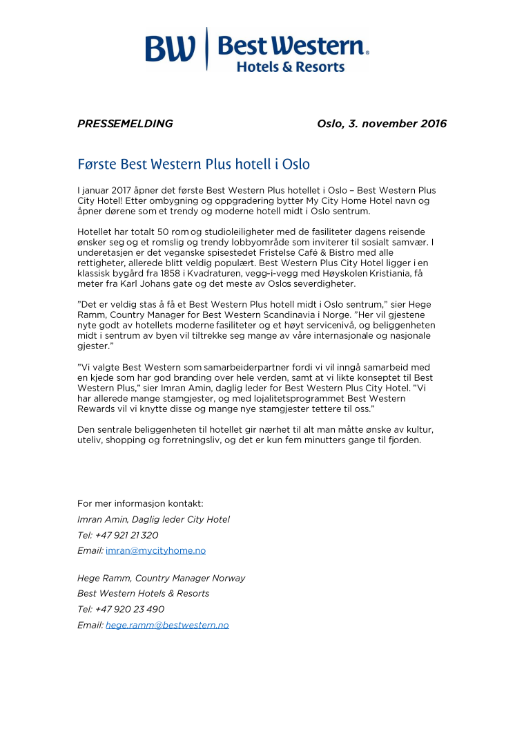 ”Det er veldig stas å få et Best Western Plus hotell midt i Oslo sentrum,” sier Hege Ramm, Country Manager for Best Western Scandinavia i Norge. ”Her vil gjestene nyte godt av hotellets moderne fasiliteter og et høyt servicenivå, og beliggenheten midt i sentrum av byen vil tiltrekke seg mange av våre internasjonale og nasjonale gjester.”