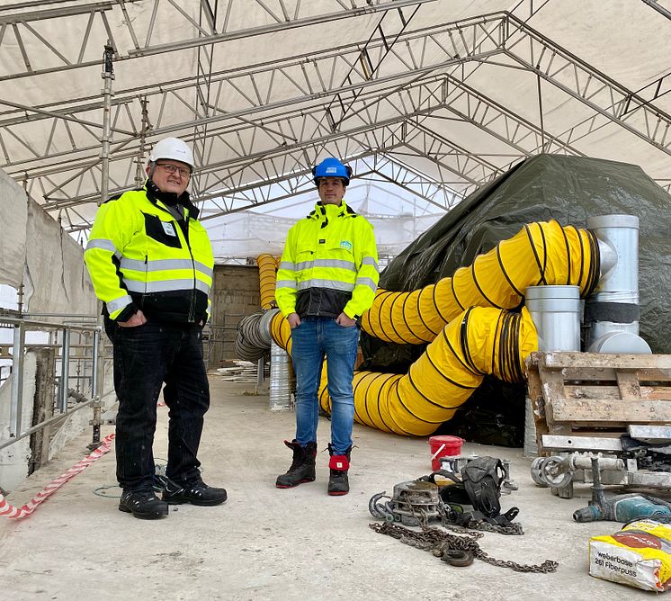 Boligbyggs prosjektleder Olav Væhle og Jonas Haarseth som er anleggsleder for entreprenør HAB Constructions på det tekniske taket som er i ferd med å bli bygget opp.