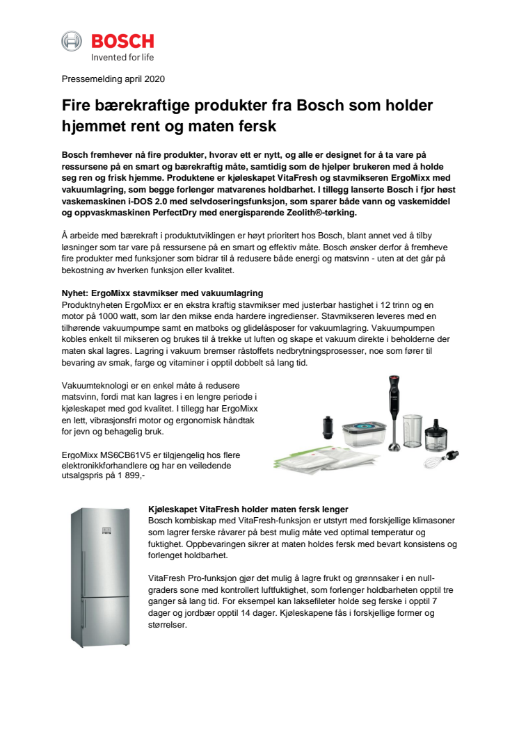 Fire bærekraftige produkter fra Bosch som holder hjemmet rent og maten fersk
