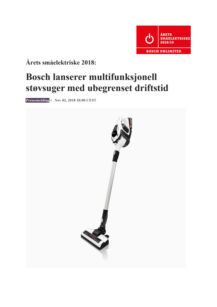 Nye Unlimited fra Bosch er en ledningsfri, fleksibel støvsuger som – akkurat som navnet tilsier – har ubegrenset driftstid. Bosch Unlimited gikk nylig av med seieren «årets småelektriske 2018/2019» under kåringen Årets Julegave som arrangeres av Fagbladet Elektronikkbransjen.