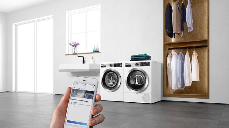 Klesvask med Home Connect vil gjøre hverdagen enklere for brukerne, og hjelpe dem til å utnytte tiden sin bedre. Kombinert med den nye generasjonen av avanserte vaskemaskiner og tørketromler, kommer Home Connect nå med det nye Smart Dry-programmet. Takket være avansert sensorteknologi og intelligent ingeniørkunst, er vaskemaskinen og tørketrommelen sammenkoblet. Vaskemaskinen sender parameterne fra den siste klesvasken (program, mengde og gjenværende fuktighetsinnhold) til tørketrommelen, som automatisk velger tilpasset innstilling for tørkeprosessen. Funksjonen er tilgjengelig på alle tørketromler med Home Connect 2.0, samt på alle vaskemaskiner med Home Connect fra Bosch, og gjør det enklere å oppnå perfekte vaske- og tørkeresultater.