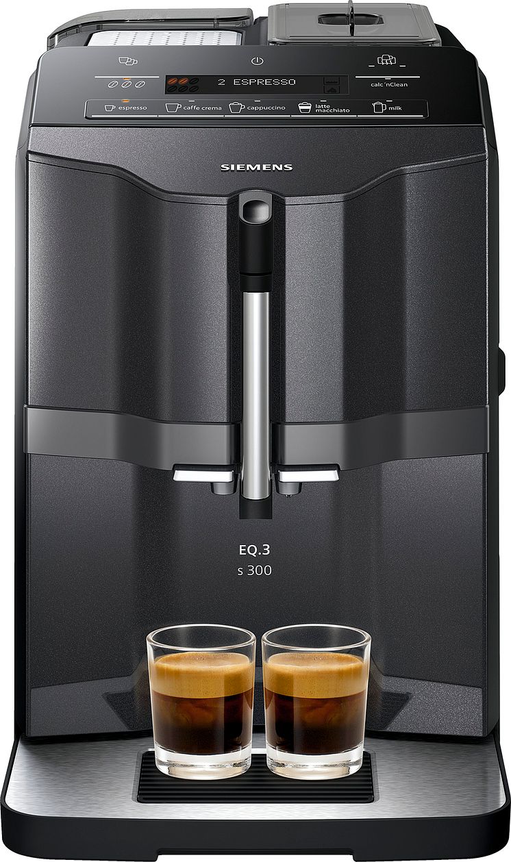 EQ.3 s300 (TI303203RW og TI313219RW) – Lakkert front med innslag av Titan- eller Safirsvart metallic. Har display med aktiv koppvarmer og tilbyr fem ulike kaffestyrker. Ca. pris: 6 999 NOK. I butikk nå.