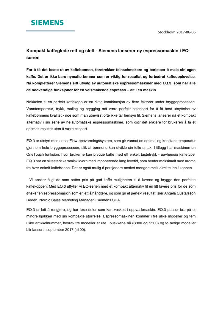 - Vi ønsker å gi de som setter pris på god kaffe muligheten til å kverne og brygge den perfekte kaffekoppen. Med EQ.3 utfyller vi EQ-serien med et kompakt alternativ til en litt lavere pris for de som ønsker en espressomaskin som er lett å håndtere, og som gir et perfekt resultat, sier Angela Gustafsson Redén, Nordic Sales Marketing Manager i Siemens SDA.