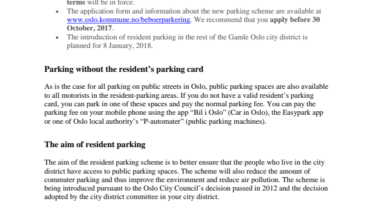30. oktober 2017 innføres permanent beboerparkering i prøveområdet i Bydel Gamle Oslo. Samtidig avvikles prøveordningen i dette området og alle som har beboerparkeringskort må søke på nytt.