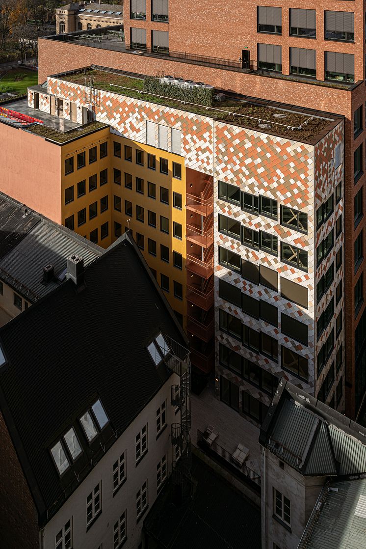 I bygget har Entra gått opp løypa for ombruk på en rekke områder. Eksisterende bygningsmasse er rehabilitert, og det er oppført et tilbygg der en stor andel av komponentene er ombrukte byggevarer.