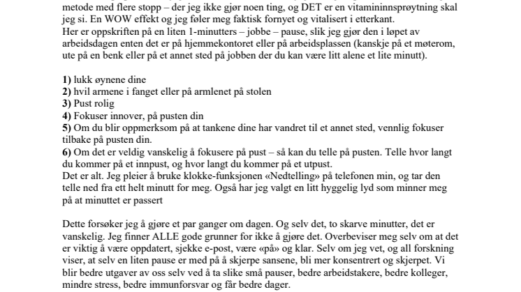 Her er oppskriften på en liten 1-minutters – jobbe – pause, slik jeg gjør den i løpet av arbeidsdagen enten det er på hjemmekontoret eller på arbeidsplassen (kanskje på et møterom, ute på en benk eller på et annet sted på jobben der du kan være litt alene et lite minutt).