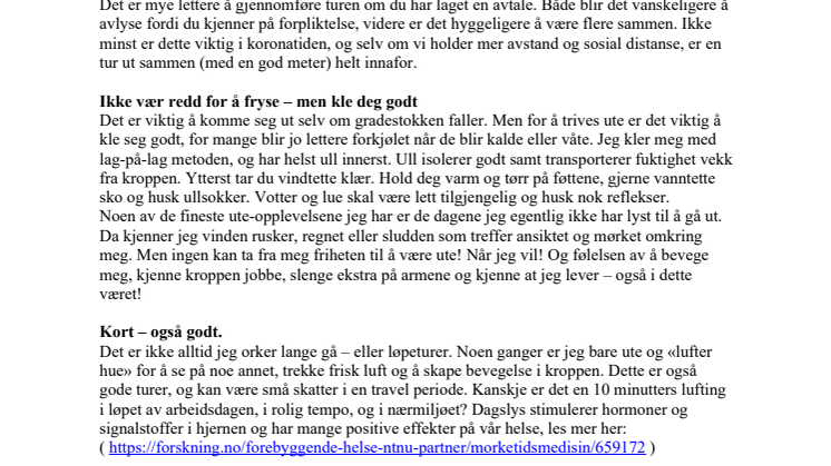 Frisk luft, dagslys og bevegelse, vi vet at det er godt for oss. I tillegg til det psykiske med en endring og å komme seg ut av huset, setter bevegelse og mosjon i gang en rekke positive prosesser i kroppen (se f. eks hva Folkehelseinstituttet anbefaler oss her: ( https://nhi.no/trening/aktivitet-og-helse/treningsrad-generelle/fysisk-aktiv-hvorfor-mirakelkur-for-kropp-og-sinn/ ) Men noen ganger er det vanskelig å komme over dørterskelen. Her kommer 5 gode råd: