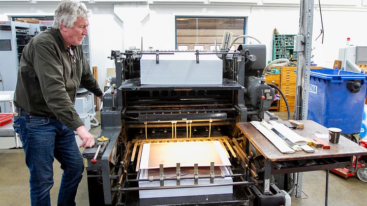 – Starten på året har vært overraskende bra, forteller storformatansvarlig og medeier Ronny Neskvern, mens han viser frem trykte glassplater med polarbilder, unike kartbøker og annen polarhistorie de har produsert for Frammuseet. Samtidig beveger vi oss over i en mer stille del av produksjonshallen, der de på slutten av fjoråret ryddet plass til sin nyeste investering; en Canon Colorado 1650.