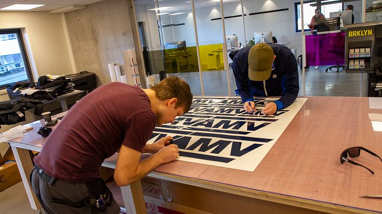 Colorado-printeren er i full sving med å produsere 30 meter sammenhengende vindusdekor for Flekkefjord sparebank når vi besøker designstudioet BRKLYN i Flekkefjord. Der håndterer fem kreative mennesker alle typer oppdrag, fra idé og foto til ferdig produksjon på et stort spekter av materialer.