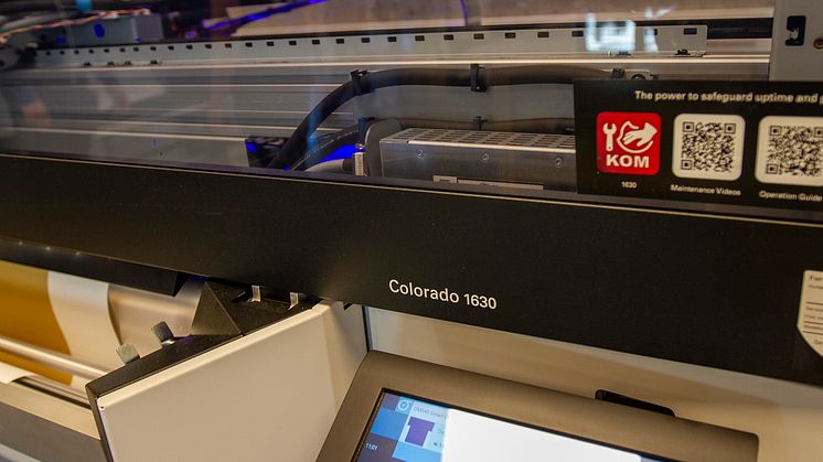 Mens Ronald og gode BRKLYN-kolleger har vist oss rundt i de inspirerende lokalene, der vi blant annet finner tekstilprintere, kraftige arbeidsstasjoner og kofferter fulle av foto- og lysutstyr, har bedriftens nye Canon Colorado 1630 produsert ferdig 30 meter vindusfolie for den lokale bankens filial i Mandal. Printeren har arbeidet uten tilsyn med print på selvklebende Easy Dot materiale, og til og med rullet folien opp på rull slik at den er helt klar for montasje.
