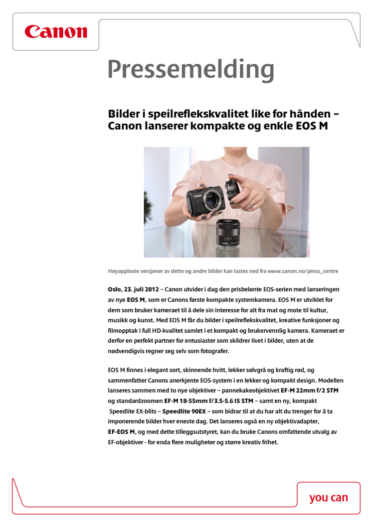 Canon utvider den prisbelønte EOS-serien med lanseringen av nye EOS M, som er Canons første kompakte systemkamera. EOS M er utviklet for dem som bruker kameraet til å dele sin interesse for alt fra mat og mote til kultur, musikk og kunst. Med EOS M får du bilder i speilreflekskvalitet, kreative funksjoner og filmopptak i full HD-kvalitet samlet i et kompakt og brukervennlig kamera.