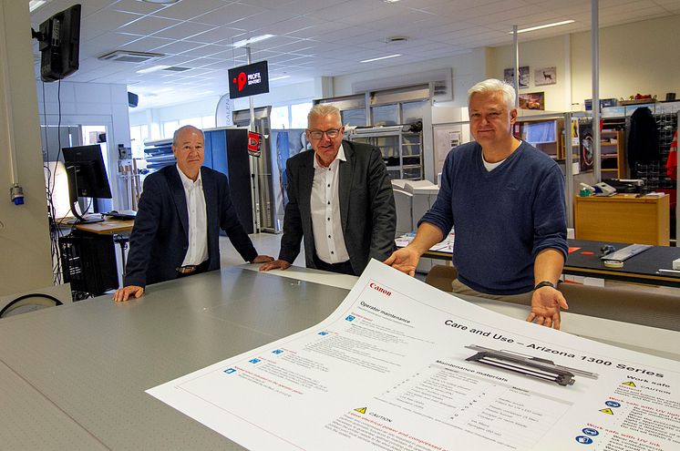 God stemning når Gunnar i Profilsenteret har besøk av Jarle Mikkelsen og Anton Strand fra Canon. - Godt samarbeid med Canon gjennom mange år var utslagsgivende for at vi valgte nyeste Arizona-generasjon, sier lederen av Profilsenteret.