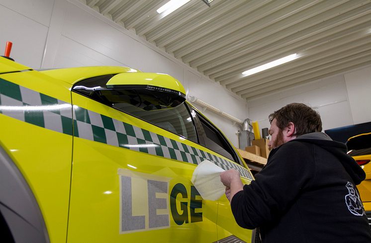 I monteringshallen får ambulansetjenestens nyeste utrykningskjøretøy påført dekor som skal tåle det meste.