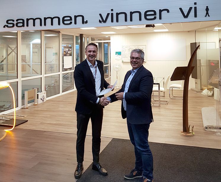 Lars Dybwad fra Canon gratulerer eier og leder Lars Gundersen i C-you med Canon- teknologi som gir høyere automatisering og kapasitet.
