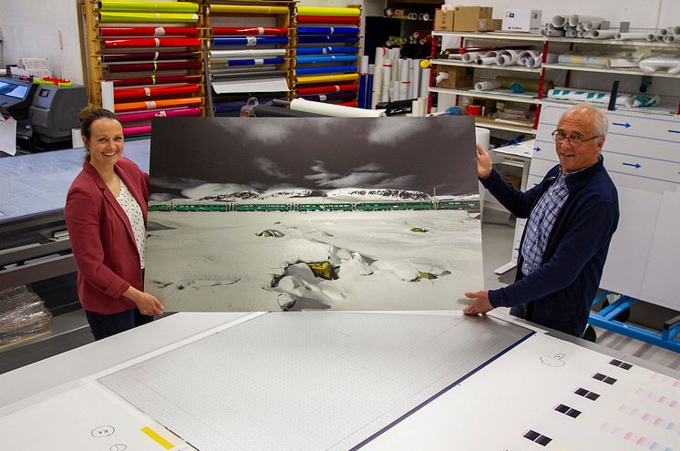 Naturbilde fra Bergensbanen med Hallingskarvet i bakgrunnen, printet på plater av børstet aluminium.