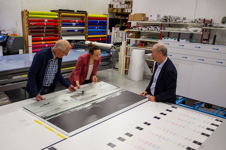 Naturbilde fra Bergensbanen med Hallingskarvet i bakgrunnen, printet på plater av børstet aluminium. Anita Thorbjørnsrød og Hans Martin Gulliksrud i Skilt design får gode råd fra Canons kundeansvarlig Jarle Mikkelsen (t.h.) med på kjøpet.
