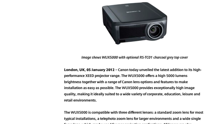 London, UK, 05 January 2012 – Canon today unveiled the latest addition to its high-performance XEED projector range. The WUX5000 offers a high 5000 lumens brightness together with a range of Canon lens options and features to make installation as easy as possible. The WUX5000 provides exceptionally high image quality, making it ideally suited to a wide variety of corporate, education, leisure and retail environments.