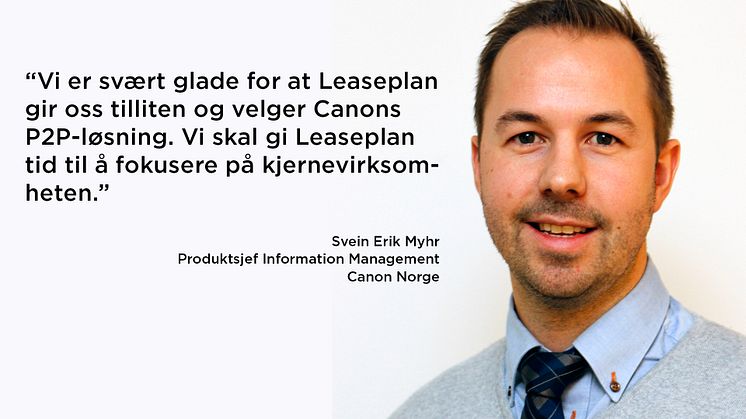 - Vi er svært glade for at Leaseplan gir oss tilliten og velger Canons P2P-løsning. Vi ønsker å effektivisere våre kunders forretningsprosesser og bidra til bedre lønnsomhet.Med den nye løsningen kan Leaseplan strategisk jobbe for lavere innkjøpskostnader, fakturaer kan knyttes til innkjøpsordrer eller følgesedler automatisk før de sendes for godkjenning på mobil. Alt dette gir Leaseplan tid til å fokusere på kjernevirksomheten.