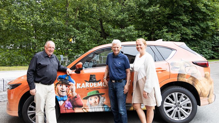 NYTT SAMSPILL: Bilde foran Kardemomme By bilen. Fra venstre Henning Hagelund hos Canon Norge, Bjørn Egner og Heidi Palm Sandberg hos Qvisten Animation Foto: Canon