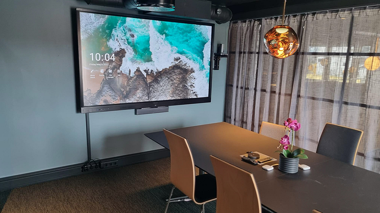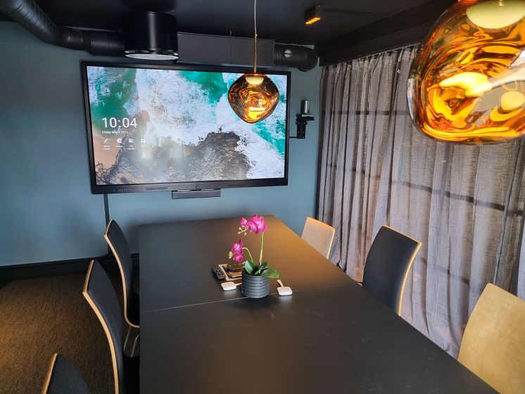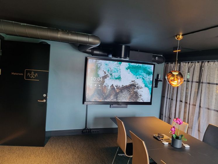 På veggen i det første møterommet henger det en Hisense 86" Interaktiv 4K møteromsskjerm som både kan brukes som en vanlig møteromskjerm, men også digitalt whiteboard. Den innebygde tavleappen lar brukere enkelt skrive, tegne og slette informasjon på skjermen gjennom berøring, enten for hånd eller med medfølgende penner. Skjermen gjenkjenner opptil 20 berøringer samtidig, noe som er ideelt for samtidig bruk av flere møtedeltakere. Man kan koble seg trådløst til skjermen via Wi-Fi dongel, miracast og Airplay eller med en kablet tilkobling.