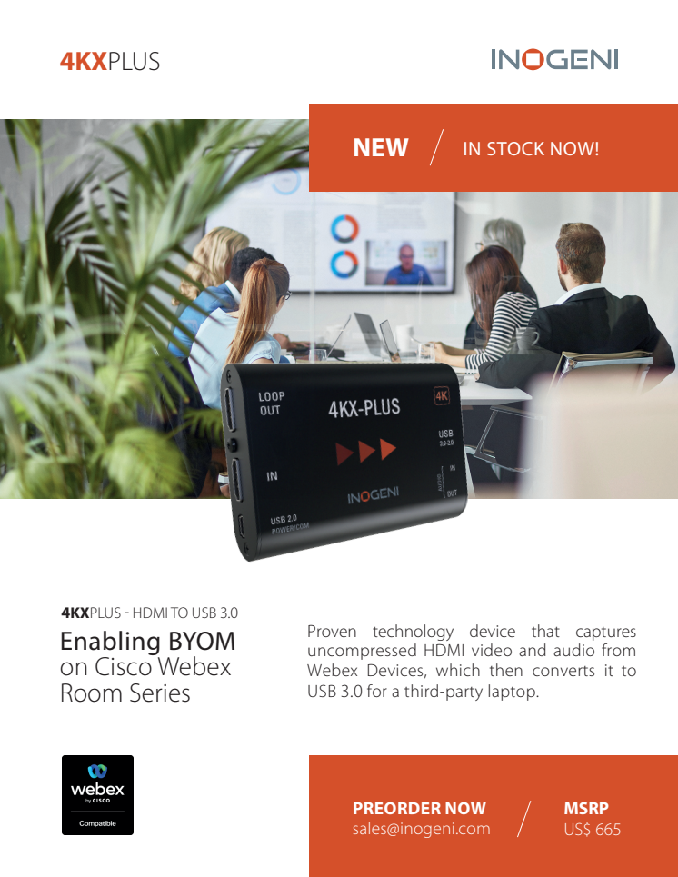 INOGENI lanserer 4KX-PLUS – HDMI til USB 3.0 aktiverer BYOM på Cisco Webex Room Series