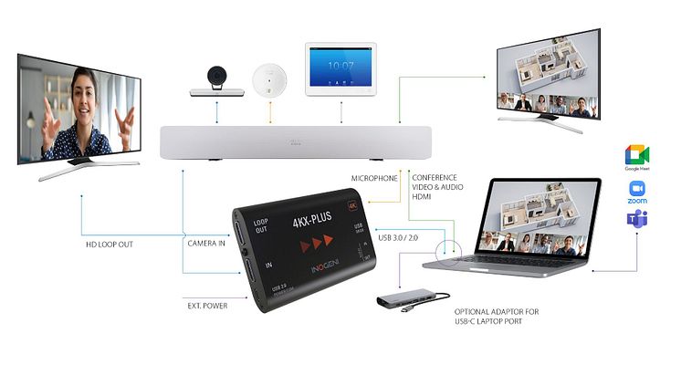 4KX-PLUS er designet for enkel tilgang til Cisco Webex-systemet av en bærbar PC med tredjeparts CODEC-programvare. Faktisk kan 4KX-PLUS, som alle INOGENI-produkter, fungere med alle virtuelle møteromsprogramvare, som Microsoft Teams, Zoom, Google Meet eller BlueJeans.
