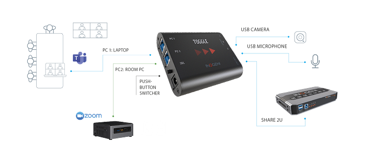 Det er her INOGENI sin TOGGLE USB 3.0 kommer inn. USB-switchen kan støtte flere UC-plattformer (unified communication) i samme rom. Ved å bruke funksjonen for automatisk bytte, vertsbryterknappen eller fjernkontrollen, kan brukere benytte seg av Rom PC eller den bærbare datamaskinen med romutstyret for å sikre et optimalt samarbeid uten teknologiproblemer.
