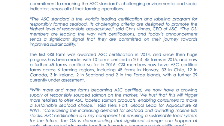 “The ASC standard is the world’s leading certification and labeling program for responsibly farmed seafood. Its challenging criteria are designed to promote the highest level of responsible aquaculture,” said Chris Ninnes, CEO of ASC. “The GSI members are leading the way with certifications, and today’s announcement sends a significant signal that they are committed on their journey towards improved sustainability.”