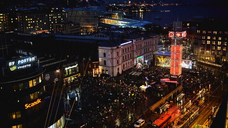 (Oslo, 8. mars, 2019) Tusenvis trosset regnet og fant veien til Jernbanetorget torsdag kveld, for å se en “flyvende” Petter Stordalen, kjente artister og storslagent fyrverkeri.
