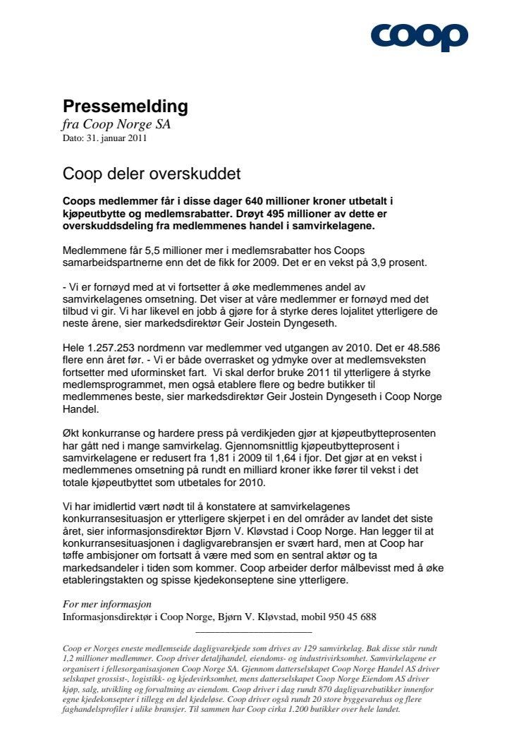 Coops medlemmer får utbetalt 640 millioner kroner utbetalt i kjøpeutbytte og medlemsrabatter for handel i 2010.