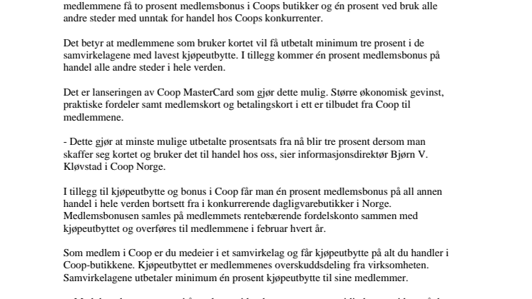 - Dette gjør at minste mulige utbetalte prosentsats fra nå blir tre prosent dersom man skaffer seg kortet og bruker det til handel hos oss, sier informasjonsdirektør Bjørn V. Kløvstad i Coop Norge.