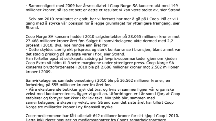 - Selv om 2010-resultatet er godt, har vi fortsatt har mer å gå på i Coop. Nå er vi i gang med å styrke vår posisjon for å legge grunnlaget for ytterligere framgang, sier Strand.