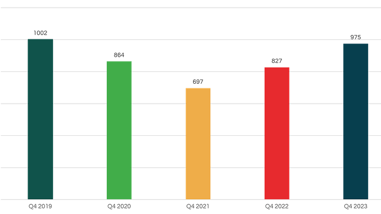 Totalt ble det registrert 975 konkurser i fjorårets fjerde kvartal. Det gir en økning på 18% sammenlignet med 827 konkurser i samme periode i 2022.