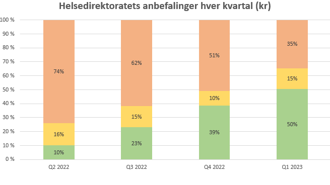 For eksempel har en skole i Akershus, Bjørkelangen vgs, gått fra å ha et måltidstilbud bestående av matvarer hvor kun 10 % var innenfor Helsedirektoratets anbefalinger og 74 % var utenfor i andre kvartal 2022 til 50 % innenfor og 35 % utenfor i første kvartal 2023.