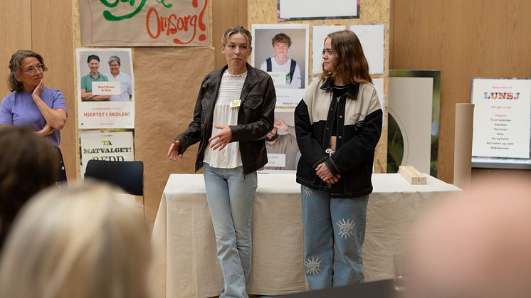 Linnea Bell Larsson og Nora Ålvik, elever ved Lillestrøm vgs, gir innspill på hvordan man best kommuniserer med elever om det nye, bærekraftige måltidstilbudet.