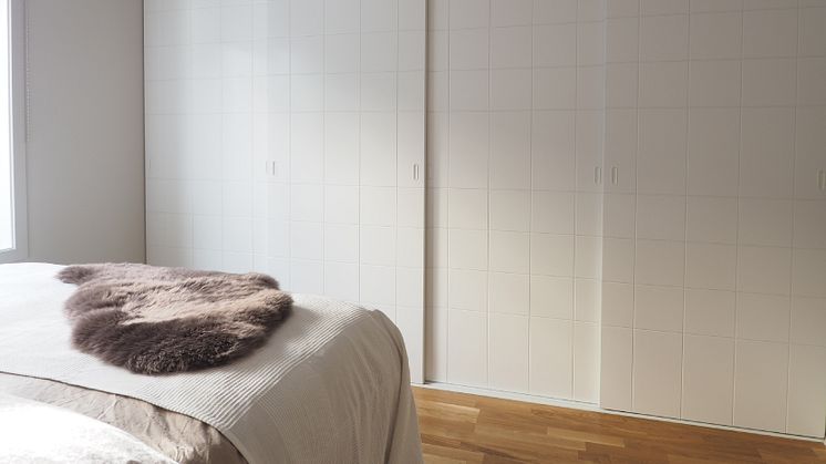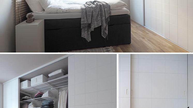 Den nye løsningen utnytter hele veggen og rommer mye mer enn det gamle skapet, men gir likevel rommet en ryddigere følelse med sømløse hvite skyvedører. Innredningen er tilpasset hennes behov, men kan enkelt bygges om når hun ønsker.
