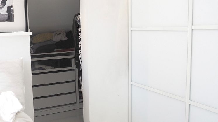 Benedicthe og ektemannen Egor har en åpen walk-in-garderobe der alt av klær som kan brettes oppbevares, men manglet plass til hengende plagg og sko. Soverommet er lyst og lekkert, og hun ønsket å bevare den rene, åpne følelsen. En skreddersydd garderobeløsning med skyvedører langs den ene veggen ble løsningen.