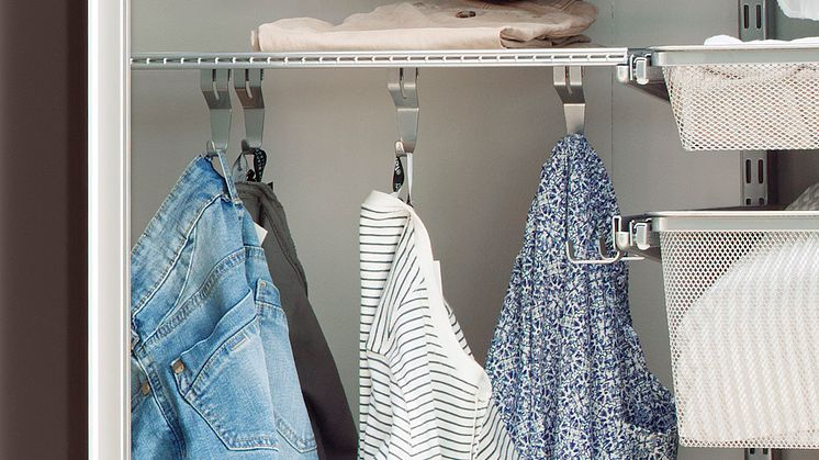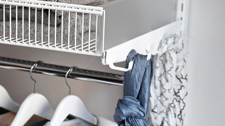 En supernyttig krok som kan plasseres hvor som helst i Elfa-systemet ditt. Hekt universalkroken på en av trådene i trådhyllen og du kan dra dem frem og tilbake for plassering der du vil. Passer til alt fra klær, skjerf, belter eller nøkler. Passer godt til barn som kanskje synes det er vanskelig å brette klærne inn i garderoben. Heng så mange kroker du vil under en hylle så kan de bare henge klærne i hempene. Lett å finne og lett å få tak i.