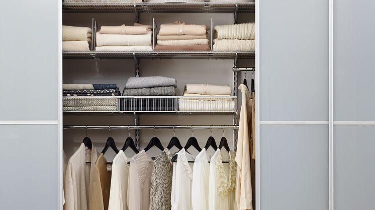 Før klærne skal inn i skapet, kan det lønne seg å ta en titt på oppbevaringsløsningene som finnes i skapet ditt. Trenger du flere kleshengere, kroker eller kurver? Hvis du har et Elfa-system kan du bygge det om for å passe klærne dine. Legg til flere uttrekkbare kurver, buksehengere, skohyller eller flytt garderobestengene hvis det gjør garderoben ryddigere og mer funksjonell i hverdagen din.