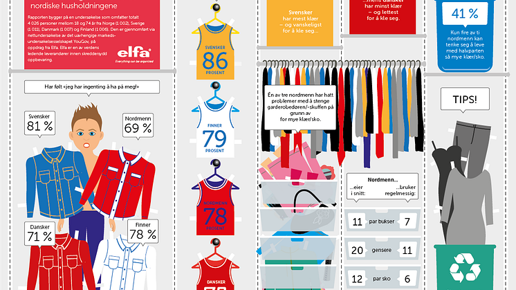 Norske klesskap bugner av klær, sko og vesker. I følge en fersk undersøkelse gjennomført på vegne av Elfa, består en gjennomsnittlig garderobe av 61 klesplagg, sko og vesker. Ikke bare gir det problemer med oppbevaring – vi bruker kun en brøkdel av plaggene på jevnlig basis. Da er det godt at vi er på topp i Norden hva gjelder gjenbruk.