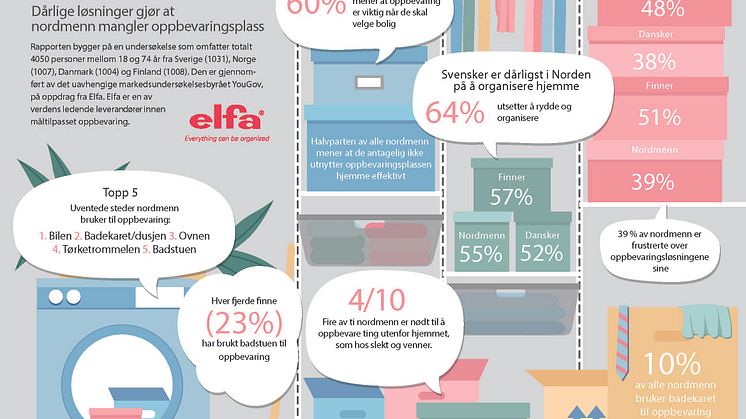 En fersk undersøkelse viser at nordmenn river seg i håret over manglende skap- og oppbevaringsplass. Nesten 40 prosent av oss må finne plass til rotet vårt utenfor huset. Men undersøkelsen som er gjort på oppdrag av Elfa, viser også at vi ikke er gode nok til å utnytte den plassen vi faktisk har.