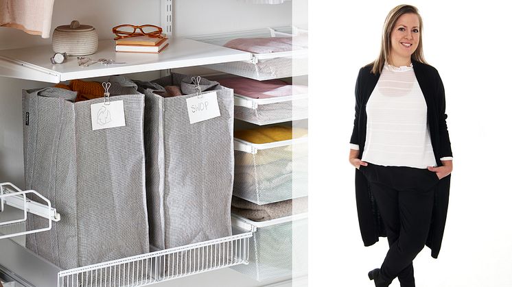 -Gjør det til en rutine å ta på deg «ryddebrillene», og få unna litt hver uke, eller månedom det føles mer realistisk. Da unngår du hauger som til slutt kjennes overveldende å ta tak i. Plasser en eske synlig i garderoben, der du legger klær og sko du sjelden bruker. Når den er full (og du ikke har savnet noe av det som ligger i den)