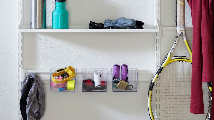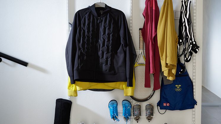 – Både min mannen og jeg kommer av og til rett inn i kjelleren utenfra, med gjørmete joggesko og en fuktig vindjakke. Vi har kanskje vært ute og løpt og vil ikke henge svette eller fuktige klær sammen med de andre klærne. Da er det flott at de kan henge luftigere. Og det er smart å ha små hyller og skuffer til gymkort, vannflasker, hengelåser og sånne ting du må sette fra deg et sted etter en treningsøkt.