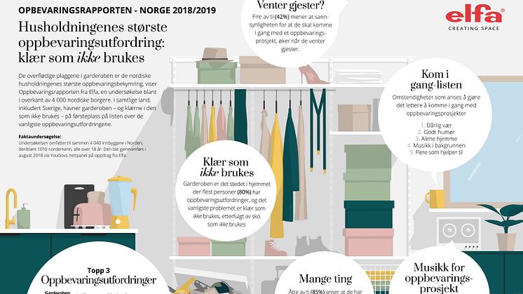 For fjerde år på rad utgir Elfa "Oppbevaringsrapporten", som undersøker vaner, holdninger og følelser knyttet til oppbevaring i hjemmet. Undersøkelsen, gjennomført av YouGov på oppdrag fra Elfa, omfatter 4 040 personer som bor i Norden, deriblant 1010 nordmenn.